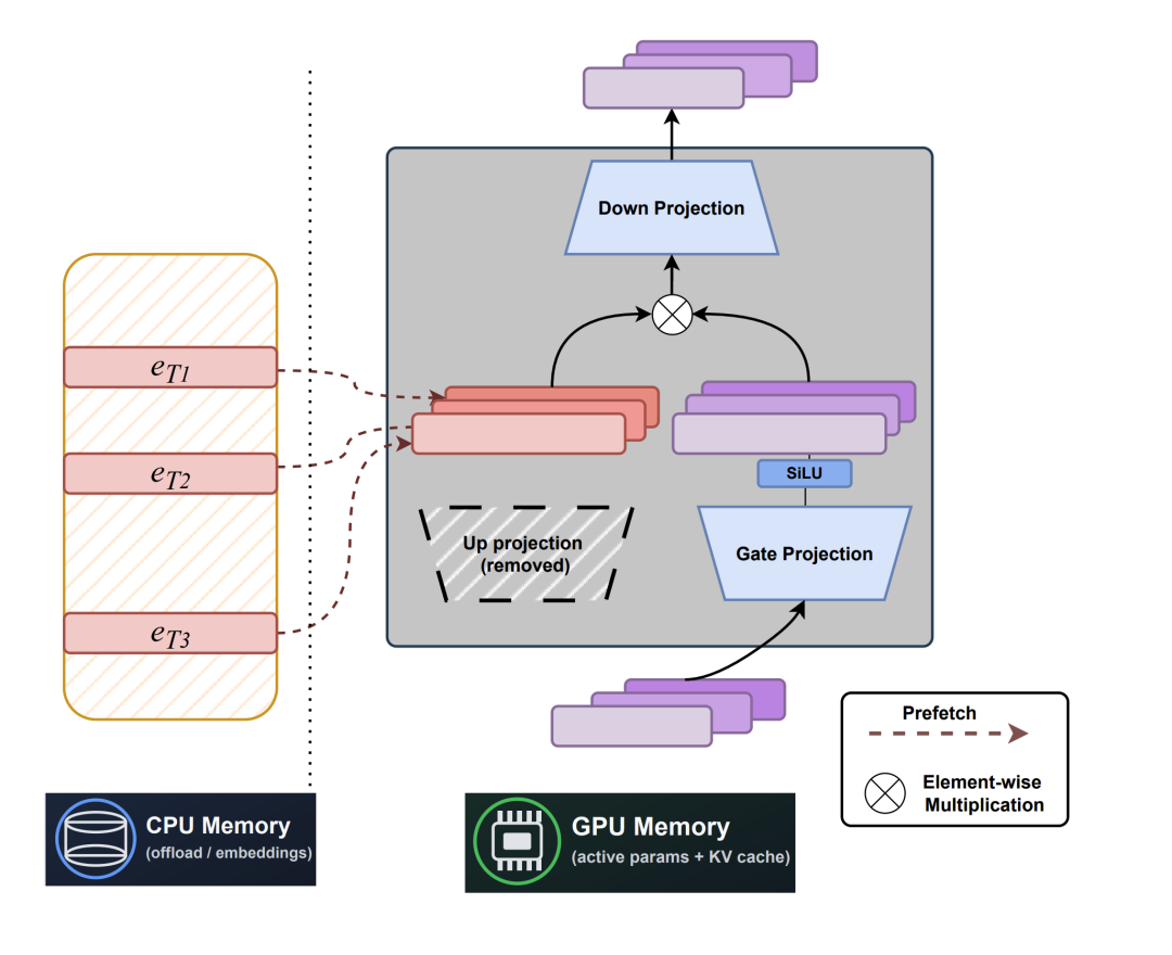 完整保留gate与down-projection模块,用于对查表得到的向量进行上下文的压缩与调制 。