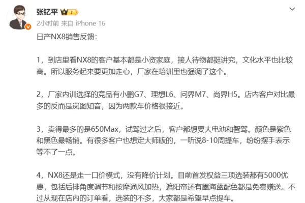 【CNMO科技消息】4月17日,博主“张钇平”发布东风日产NX8的终端销售反馈,从客户画像、竞品对比到畅销配置,全方位呈现了这款新车的真实市场表现。